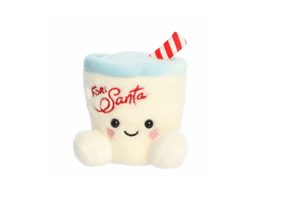 Kris is a white plush glass of milk with a sky-blue rim, candy-striped straw, and “For Santa” embroidered in red script. Her sweet face and cozy cup shape give her just enough innocence to hide all her playful plotting.