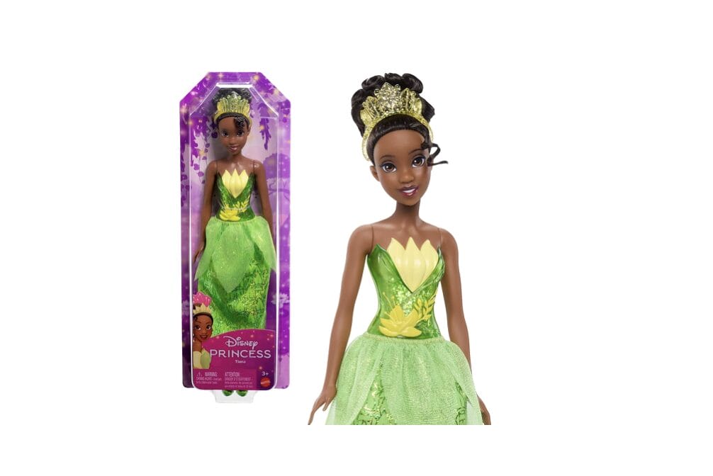 Meet this Princess Tiana doll, inspired by the ambitious and determined heroine from Disney’s The Princess and the Frog. This posable fashion doll is shown in a sparkling outfit and accessories that include shoes and a tiara. In her signature look from the movie, this Tiana doll is ready for any adventure! Doll cannot stand alone. Colors and decorations may vary.