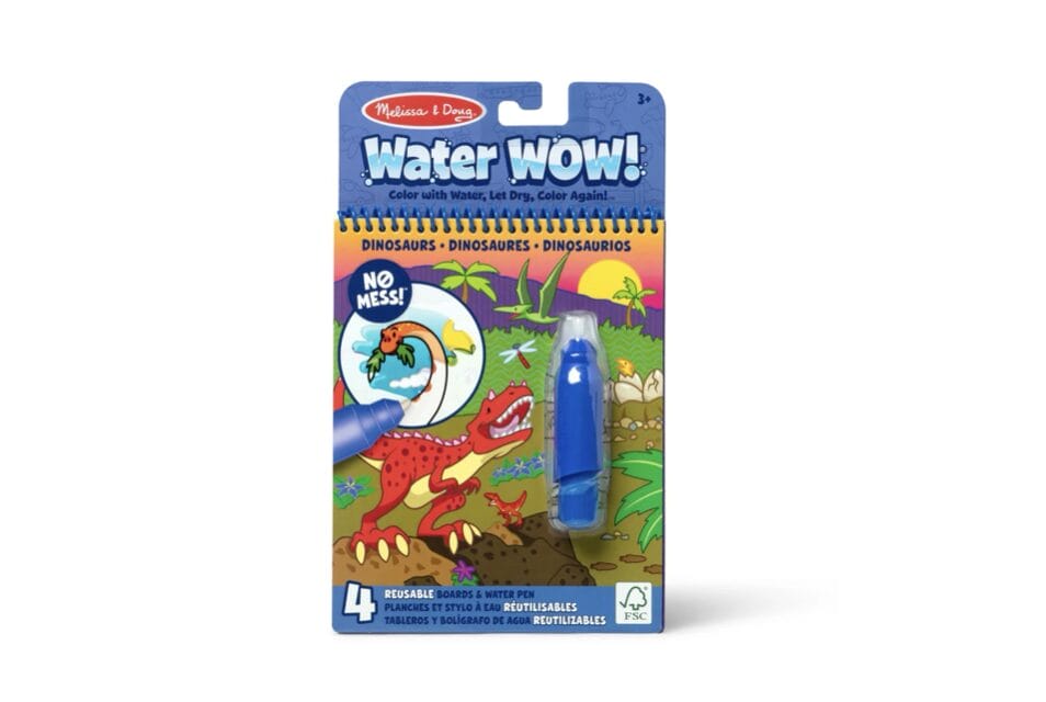 • Water WOW! Reveal Coloring Fun – Use the chunky refillable water pen to bring 4 dinosaur-themed reusable pages to life with vibrant colors—no ink, no paint, no mess, just water!