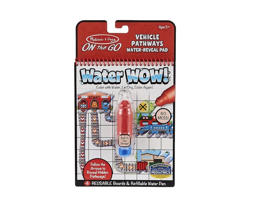 - 4 spiral-bound multi-path vehicle-themed coloring boards and refillable water pen