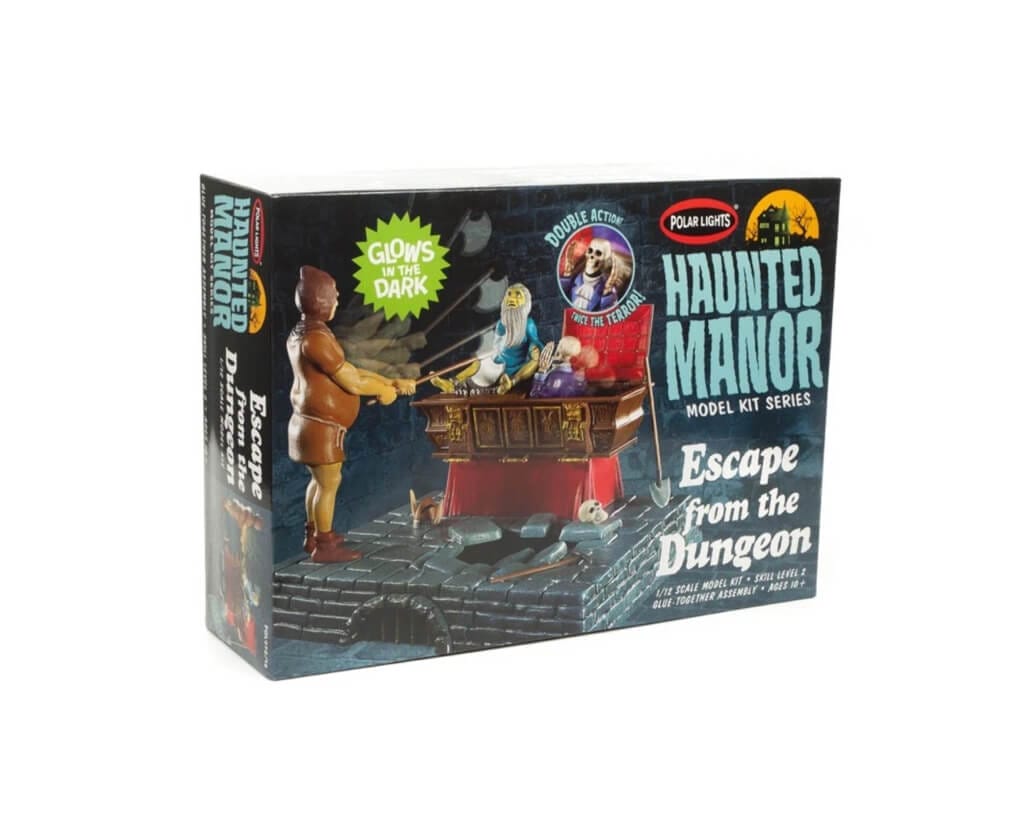 The Escape From the Dungeon glue-together model kit is the first release in the haunted Manor series of kits from Polar Lights that re-introduces fun, spooky models from years past. The kit features fine details on every part. It uses rubber band action to spring two moving figures. In Escape From the Dungeon, is the executioner offering a near miss or a favor that will free our diminutive friend? In either case, another long-dead ghoul has something to say about it! The model base is 8 3/4″ wide and 7″ long. The plastic model even glows in the dark (if left unpainted).