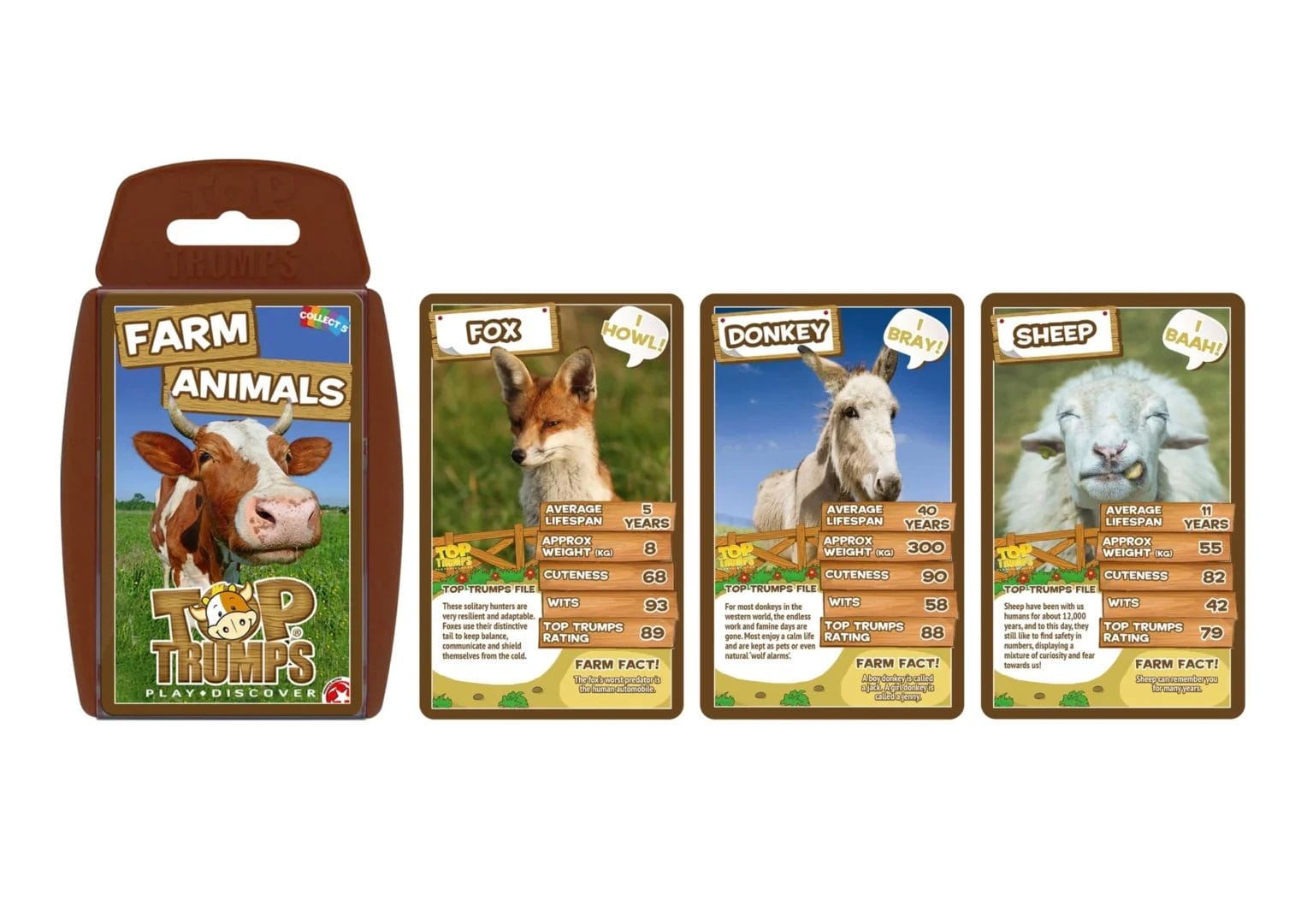 - Find out the average lifespan of a Donkey, the wits of a Fox and the cuteness of a Sheep in this edition of Top Trumps – Farm Animals